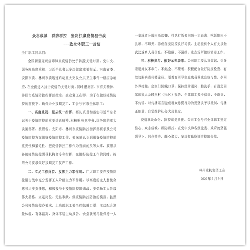 會議根據(jù)林州市委、市政府部署,及時推遲公司復(fù)工時間,并成立林州重機(jī)疫情防控工作領(lǐng)導(dǎo)小組及四個保障小組,全 面動員和落實疫情防控工作。